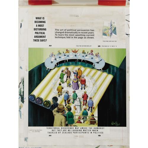 <B>Al Jaffee - Mad #184 Fold-In Back Cover Original Art (EC, 1976).</B></I> Al Jaffee's fold-in asks "What is becoming a most disturbing political argument these days?" Snappy fold-in answer sez: "Terrorist tactics." This fold-in scene has an image area of 17" x 21", and the art is in Excellent condition. Also included are two production overlays -- one with an amberlith screen and one with type instructions. <I>From the Mad Magazine Archives.</B></I>