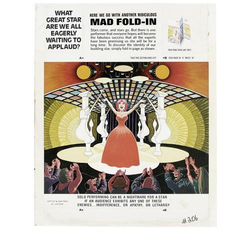 <B>Al Jaffee - Mad #206 Fold-In Back Cover Original Art (EC, 1979).</B></I> Al Jaffee's fold-in asks "What great star are we all eagerly waiting to applaud?" Snappy fold-in answer sez: "Solar energy." Painted on illustration board, this fold-in scene has an image area of 17" x 21", and the art is in Very Good condition. Also included are two production overlays - one with an amberlith screen, and one with type instructions. <BR><BR><B>Important notice:</B> Heritage usually auctions material at the rate of 200-250 lots per hour. On some occasions eBay Live bid software or the Internet may not be able to keep up with the pace of the auction. We recommend placing a realistic absentee bid now as insurance to avoid disappointment. Occasionally the auctioneer may eliminate or reject an eBay Live bid, and the auctioneer may also reopen a lot after the close of the eBay live bidding (usually because we missed an audience bid), and may reject your bid even if it shows you as the winning bidder. By bidding via eBay Live, you agree that Heritage may award the lot to another bidder at its sole discretion under the circumstances described above or any other reasonable circumstances. Since eBay bids are not shown to us until we open the lot on the floor, we treat those bids just like floor bids. In most cases the floor responds before the eBay bid is presented to us, due to Internet lag time, so for consistency we have made it a policy that floor bids are always considered first over tie eBay live bids. Also please note that all Heritage lots purchased through eBay Live carry a 22.5% Buyer's Premium. Please make sure you read the Terms and Conditions before you bid. This lot is being auctioned in conjunction with a live floor auction by Heritage Auction Galleries. All final auction and invoice information will be supplied by Heritage Auction Galleries, and all other information should be considered preliminary. Lot:41001 <BR><BR><B>Winning Notification and Billing:</B> After the FINAL session in this auction is complete, Heritage will send e-mail and snail mail invoices. This process normally takes several days. All final auction and invoice information will be supplied by Heritage Auction Galleries, and all other information should be considered preliminary. <BR><BR>This auction will be conducted on a live auction floor and over the Internet through eBay Live. If you choose to place an absentee bid, please take a moment to <font color='#0000ff'><u><a href='http://pages.ebay.com/liveauctions/help/before/laabsentee.html'>learn how eBay Live absentee bidding works</a></u></font><font color='#000000'>
