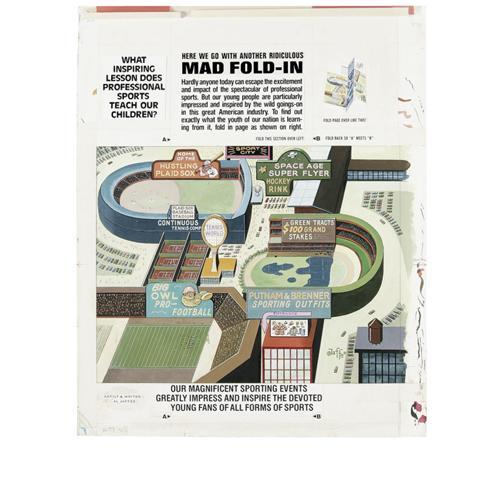 <B>Al Jaffee - Mad #208 Fold-In Back Cover Original Art (EC, 1979).</B></I> Al Jaffee's fold-in asks "What inspiring lesson does professional sports teach our children?" Snappy fold-in answer sez: "Greed." Painted on illustration board, this fold-in scene has an image area of 17" x 21", and the art is in Very Good condition. Also included are two production overlays - one with an amberlith screen, and one with type instructions. <BR><BR><B>Important notice:</B> Heritage usually auctions material at the rate of 200-250 lots per hour. On some occasions eBay Live bid software or the Internet may not be able to keep up with the pace of the auction. We recommend placing a realistic absentee bid now as insurance to avoid disappointment. Occasionally the auctioneer may eliminate or reject an eBay Live bid, and the auctioneer may also reopen a lot after the close of the eBay live bidding (usually because we missed an audience bid), and may reject your bid even if it shows you as the winning bidder. By bidding via eBay Live, you agree that Heritage may award the lot to another bidder at its sole discretion under the circumstances described above or any other reasonable circumstances. Since eBay bids are not shown to us until we open the lot on the floor, we treat those bids just like floor bids. In most cases the floor responds before the eBay bid is presented to us, due to Internet lag time, so for consistency we have made it a policy that floor bids are always considered first over tie eBay live bids. Also please note that all Heritage lots purchased through eBay Live carry a 22.5% Buyer's Premium. Please make sure you read the Terms and Conditions before you bid. This lot is being auctioned in conjunction with a live floor auction by Heritage Auction Galleries. All final auction and invoice information will be supplied by Heritage Auction Galleries, and all other information should be considered preliminary. Lot:41001 <BR><BR><B>Winning Notification and Billing:</B> After the FINAL session in this auction is complete, Heritage will send e-mail and snail mail invoices. This process normally takes several days. All final auction and invoice information will be supplied by Heritage Auction Galleries, and all other information should be considered preliminary. <BR><BR>This auction will be conducted on a live auction floor and over the Internet through eBay Live. If you choose to place an absentee bid, please take a moment to <font color='#0000ff'><u><a href='http://pages.ebay.com/liveauctions/help/before/laabsentee.html'>learn how eBay Live absentee bidding works</a></u></font><font color='#000000'>