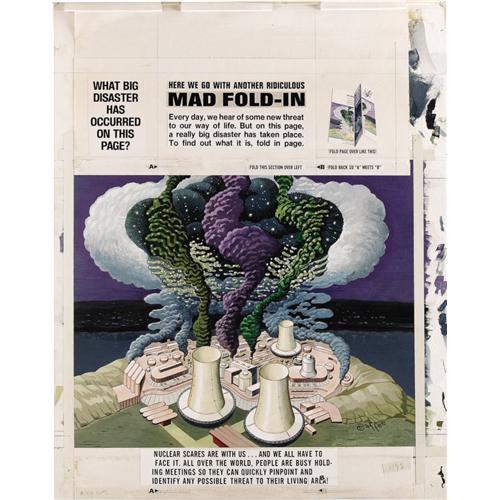 <B>Al Jaffee - Mad #213 Fold-In Back Cover Original Art (EC, 1980).</B></I> Al Jaffee's fold-in asks "What big disaster has occurred on this page?" Snappy fold-in answer sez: "No fold-in idea." This fold-in scene has an image area of 17" x 21", and the art is in Excellent condition. Also included are two production overlays -- one with an amberlith screen and one with type instructions. <I>From the Mad Magazine Archives.</B></I>