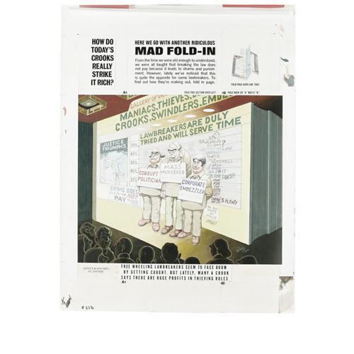 <B>Al Jaffee - Mad #224 Fold-In Back Cover Original Art (EC, 1981).</B></I> Al Jaffee's fold-in asks "How do today's crooks really strike it rich?" Snappy fold-in answer sez: "From book sales." Painted on illustration board, this fold-in scene has an image area of 17" x 21", and the art is in Very Good condition. Also included are two production overlays - one with an amberlith screen, and one with type instructions. <BR><BR><B>Important notice:</B> Heritage usually auctions material at the rate of 200-250 lots per hour. On some occasions eBay Live bid software or the Internet may not be able to keep up with the pace of the auction. We recommend placing a realistic absentee bid now as insurance to avoid disappointment. Occasionally the auctioneer may eliminate or reject an eBay Live bid, and the auctioneer may also reopen a lot after the close of the eBay live bidding (usually because we missed an audience bid), and may reject your bid even if it shows you as the winning bidder. By bidding via eBay Live, you agree that Heritage may award the lot to another bidder at its sole discretion under the circumstances described above or any other reasonable circumstances. Since eBay bids are not shown to us until we open the lot on the floor, we treat those bids just like floor bids. In most cases the floor responds before the eBay bid is presented to us, due to Internet lag time, so for consistency we have made it a policy that floor bids are always considered first over tie eBay live bids. Also please note that all Heritage lots purchased through eBay Live carry a 22.5% Buyer's Premium. Please make sure you read the Terms and Conditions before you bid. This lot is being auctioned in conjunction with a live floor auction by Heritage Auction Galleries. All final auction and invoice information will be supplied by Heritage Auction Galleries, and all other information should be considered preliminary. Lot:41001 <BR><BR><B>Winning Notification and Billing:</B> After the FINAL session in this auction is complete, Heritage will send e-mail and snail mail invoices. This process normally takes several days. All final auction and invoice information will be supplied by Heritage Auction Galleries, and all other information should be considered preliminary. <BR><BR>This auction will be conducted on a live auction floor and over the Internet through eBay Live. If you choose to place an absentee bid, please take a moment to <font color='#0000ff'><u><a href='http://pages.ebay.com/liveauctions/help/before/laabsentee.html'>learn how eBay Live absentee bidding works</a></u></font><font color='#000000'>
