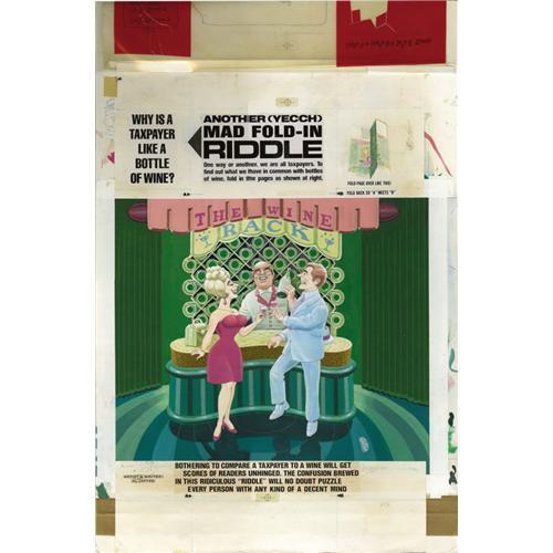 <B>Al Jaffee - Mad #230 Fold-In Back Cover Original Art (EC, 1982).</B></I> Al Jaffee's fold-in asks "Why is a tax-payer like a bottle of wine?" Snappy fold-in answer sez: "Both get screwed in the end." Painted on illustration board, this fold-in scene has an image area of 17" x 21", and the art is in Excellent condition. Also included are two production overlays -- one with an amberlith screen and one with type instructions. <I>From the Mad Magazine Archives.</B></I>
