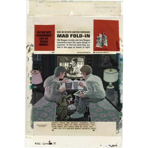 <B>Al Jaffee - Mad #232 Fold-In Back Cover Original Art (EC, 1982).</B></I> Al Jaffee's fold-in asks "Why are new 'Reaganomics' like old Reagan movies?" Snappy fold-in answer sez: "Both make us sick." Painted on illustration board, this fold-in scene has an image area of 17" x 21", and the art is in Excellent condition. Also included are two production overlays -- one with an amberlith screen and one with a photocollage. <I>From the Mad Magazine Archives.</B></I>