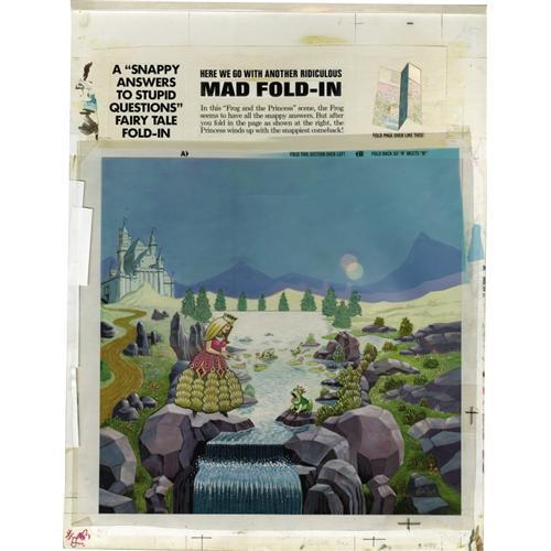 "<B>Al Jaffee - Mad #233 Fold-In Back Cover Original Art (EC, 1982).</B></I> Al Jaffee's fold-in presents ""A 'Snappy Answers to Stupid Questions' fairy tale fold-in."" And the ultimate snappy fold-in comeback crack is, ""I hope you freeze your ...[painting of an ass]."" Painted on illustration board, this fold-in scene has an image area of 17"" x 21"", and the art is in Excellent condition. Also included are two production overlays -- one with an amberlith screen, and one with word balloons. <I>From the Mad Magazine Archives.</B></I> "