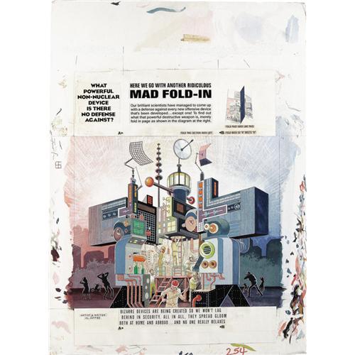 <B>Al Jaffee - Mad #254 Fold-In Back Cover Original Art (EC, 1985).</B></I> Al Jaffee's fold-in asks "What powerful, non-nuclear device is there no defense against?" Snappy fold-in answer sez: "Big boom boxes." This fold-in scene has an image area of 17" x 21", and the art is in Excellent condition. Also included are two production overlays -- one with an amberlith screen and one with type instructions. <I>From the Mad Magazine Archives.</B></I>