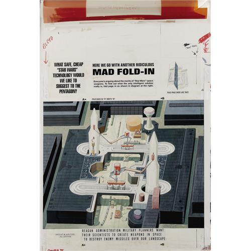 <B>Al Jaffee - Mad #256 Fold-In Back Cover Original Art (EC, 1985).</B></I> Al Jaffee's fold-in asks "What cheap 'Star Wars' technology would we like to suggest to the Pentagon?" Snappy fold-in answer sez: "Rent the tape." This fold-in scene has an image area of 17" x 21", and the art is in Excellent condition. Also included are two production overlays -- one with an amberlith screen and one with type instructions. <I>From the Mad Magazine Archives.</B></I>