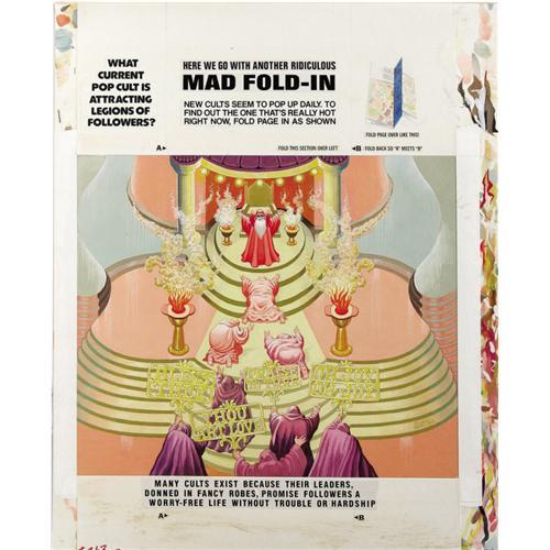 <B>Al Jaffee - Mad #263 Fold-In Back Cover Original Art (EC, 1986).</B></I> Al Jaffee's fold-in asks "What current pop cult is attracting legions of followers?" Snappy fold-in answer sez: "Madonna worship." This fold-in scene has an image area of 17" x 21", and the art is in Excellent condition. Also included are two production overlays -- one with an amberlith screen and one with type instructions. <I>From the Mad Magazine Archives.</B></I>