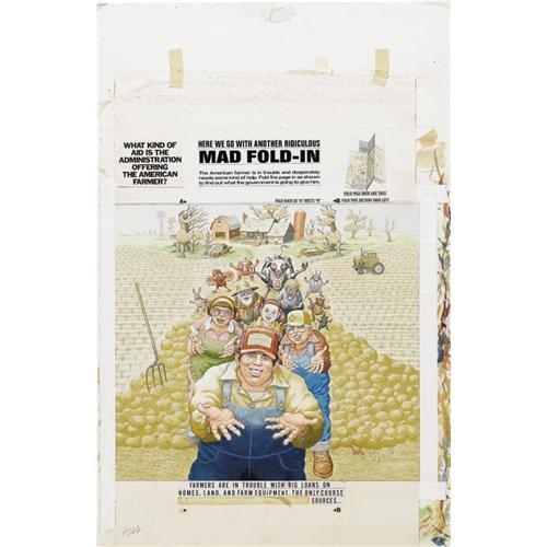 <B>Al Jaffee - Mad #266 Fold-In Back Cover Original Art (EC, 1986).</B></I> Al Jaffee's fold-in asks "What kind of aid is the Administration offering the American farmer?" Snappy fold-in answer sez: "Horse S***." Painted on illustration board, this fold-in scene has an image area of 17" x 21", and the art is in Very Good condition. <I>From the Mad Magazine Archives.</B></I><BR><BR><b>Shipping:</b> Large Flat (<a target="_blank" href="http://www.heritageauctions.com/common/shipping.php">view shipping information</a>)