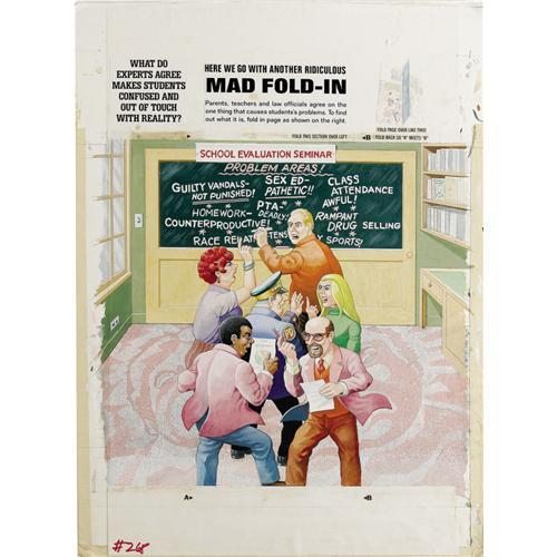 <B>Al Jaffee - Mad #268 Fold-In Back Cover Original Art (EC, 1987).</B></I> Al Jaffee's fold-in reveals "What do experts agree makes students confused and out of touch with reality?" Snappy fold-in answer sez: "Guidance Counseling." Painted on illustration board, this fold-in scene has an image area of 17" x 21", and the art is in Excellent condition. Also included are two production overlays -- one with an amberlith screen, and one with type instructions. <I>From the Mad Magazine Archives.</B></I>