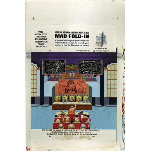 <B>Al Jaffee - Mad #272 Fold-In Back Cover Original Art (EC, 1987).</B></I> Al Jaffee's fold-in asks "Who conducted the most exhaustive Washington probe recently?" Snappy fold-in answer sez: "The President's doctors." Painted on illustration board, this fold-in scene has an image area of 17" x 21", and the art is in Excellent condition. Also included are two production overlays -- one with an amberlith screen and one with type instructions. <I>From the Mad Magazine Archives.</B></I>
