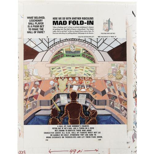 <B>Al Jaffee - Mad #293 Fold-In Back Cover Original Art (EC, 1990).</B></I> Al Jaffee's fold-in asks "What beloved, legendary ball player is a poor bet to make the hall of fame?" Snappy fold-in answer sez: "Charlie Brown." This fold-in scene has an image area of 17" x 21", and the art is in Excellent condition. Also included are two production overlays -- one with an amberlith screen and one with type instructions. <I>From the Mad Magazine Archives.</B></I>