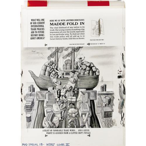 <B>Al Jaffee - Mad Super Special #19 Fold-In Back Cover Original Art (EC, 1976).</B></I> Al Jaffee's fold-in asks: "What will one of our current international trade policies add to future history books about America?" Snappy fold-in answer sez: "A black page." Painted on illustration board, the image area measures 17" x 21", and the art is in Very Good condition. <I>From the Mad Magazine Archives.</B></I><BR><BR><b>Shipping:</b> Large Flat (<a target="_blank" href="http://www.heritageauctions.com/common/shipping.php">view shipping information</a>)