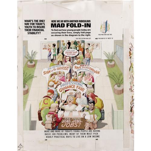 <B>Al Jaffee - Mad #313 Fold-In Back Cover Original Art (EC, 1992).</B></I> Al Jaffee's fold-in asks "What's the only way for today's youth to insure their financial stability?" Snappy fold-in answer sez: "Moving back home." This fold-in scene has an image area of 17" x 21", and the art is in Excellent condition. Also included are two production overlays -- one with an amberlith screen and one with type instructions. <I>From the Mad Magazine Archives.</B></I>