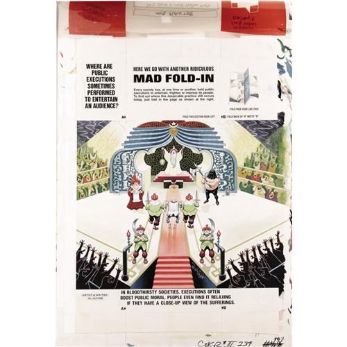 <B>Al Jaffee - Mad Super Special #70 Fold-In Back Cover Original Art (EC, 1990).</B></I> Al Jaffee's fold-in asks "Where are public executions sometimes performed to entertain an audience?" Snappy fold-in answer sez: "In boxing rings." This fold-in scene has an image area of 17" x 21", and the art is in Excellent condition. Also included are two production overlays -- one with an amberlith screen and one with type instructions. <I>From the Mad Magazine Archives.</B></I>