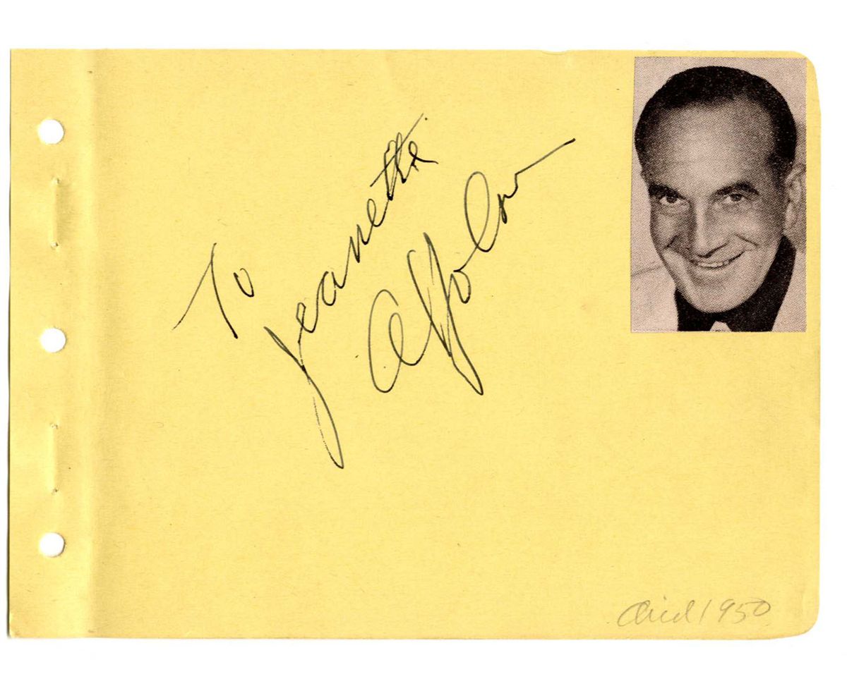 Al Jolson's signature. Single leaf from an autograph album is inscribed, ''To Jeanette / Al Jolson''. Yellow sheet with Jolson's face affixed to upper right measures 6'' x 4.5''. Pencil notation to lower right corner reads, ''died 1950''. Hole punches and staple punctures to left edge, else near fine.