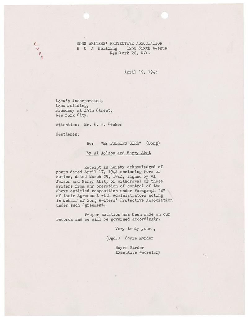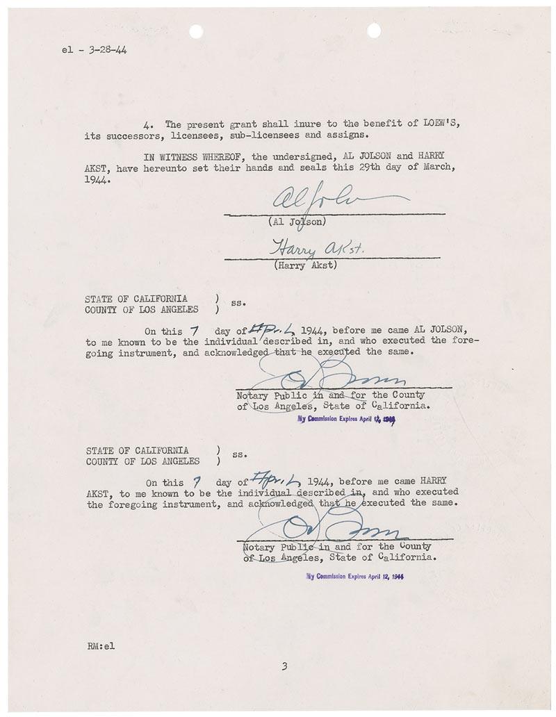 DS, signed “Al Jolson,” four pages, 8.5 x 11, April 19, 1944. Agreement in which Jolson and fellow songwriter Harry Akst grant permission to Loew’s Incorporated for the use of ‘My Follies Girl.’ In part: “The rights herein acquired by Loew’s are granted forever and shall extend through any and all copyright and renewals and extensions thereof. The writers agree to cause renewals of all copyright in the musical composition duly to be obtained and all rights herein granted are now assigned to Loew’s for the renewal term and during any extension of copyright.” Also signed by Akst. In fine condition, with light handling wear, and two punch holes and staple holes at the top of each page.