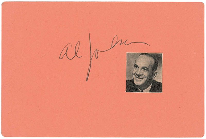 Vintage fountain pen signature, “Al Jolson,” on a dark peach 6 x 4 card with a magazine photo of Jolson affixed to the right side. In fine condition, with light corner tip dings. Accompanied by two unsigned albums.