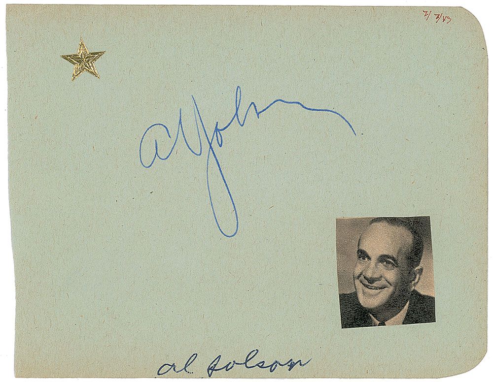 Vintage ink signature, “Al Jolson,” on a light green 5 x 3.75 album page with a affixed magazine photo and gold star. In fine condition, with some faint border toning and light wrinkling.