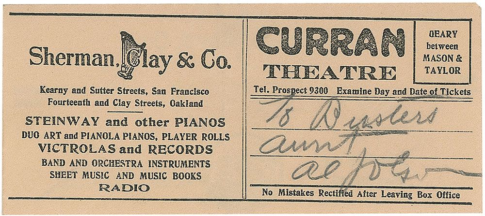 Vintage Curran Theatre ticket envelope, 4.5 x 2, signed and inscribed in pencil, “To Buster’s aunt, Al Jolson.” In fine condition. Accompanied by a certificate of authenticity from PSA/DNA. The recipient of the photo “Buster’s aunt,” was a member of the noted Collier family, active in showbiz for over a century: father William Collier, Sr., began his stage career at age eleven and successfully transitioned to the silver screen, acting in over 40 films; and son William ‘Buster’ Collier, Jr., was one of Hollywood’s leading men, making the switch from silent film to ‘talkies’ with great success. Provenance: William Collier Family Collection.