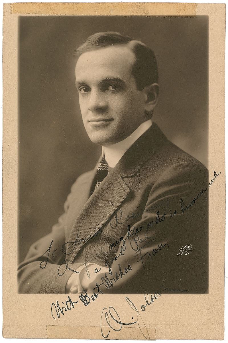 Early vintage matte-finish 5.75 x 8.75 portrait of Jolson by the White Studio of New York, signed and inscribed in fountain pen, “To Louis Rosenberg, a first nighter who is human and a good Pal, With Best Wishes from, Al Jolson.” In very good to fine condition, with old clear tape along top and bottom borders, touching the bottoms of the capital letters of the signature.