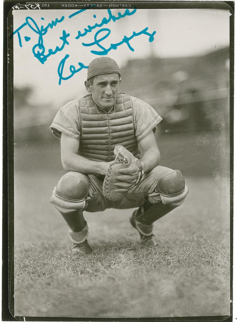 Baseball Hall of Famer. Heavyweight semi-gloss 5 x 7 photo of Lopez kneeling in his catcher’s gear, made from the original negative, signed and inscribed in blue felt tip “To Jim — Best wishes, Al Lopez.” In fine condition.