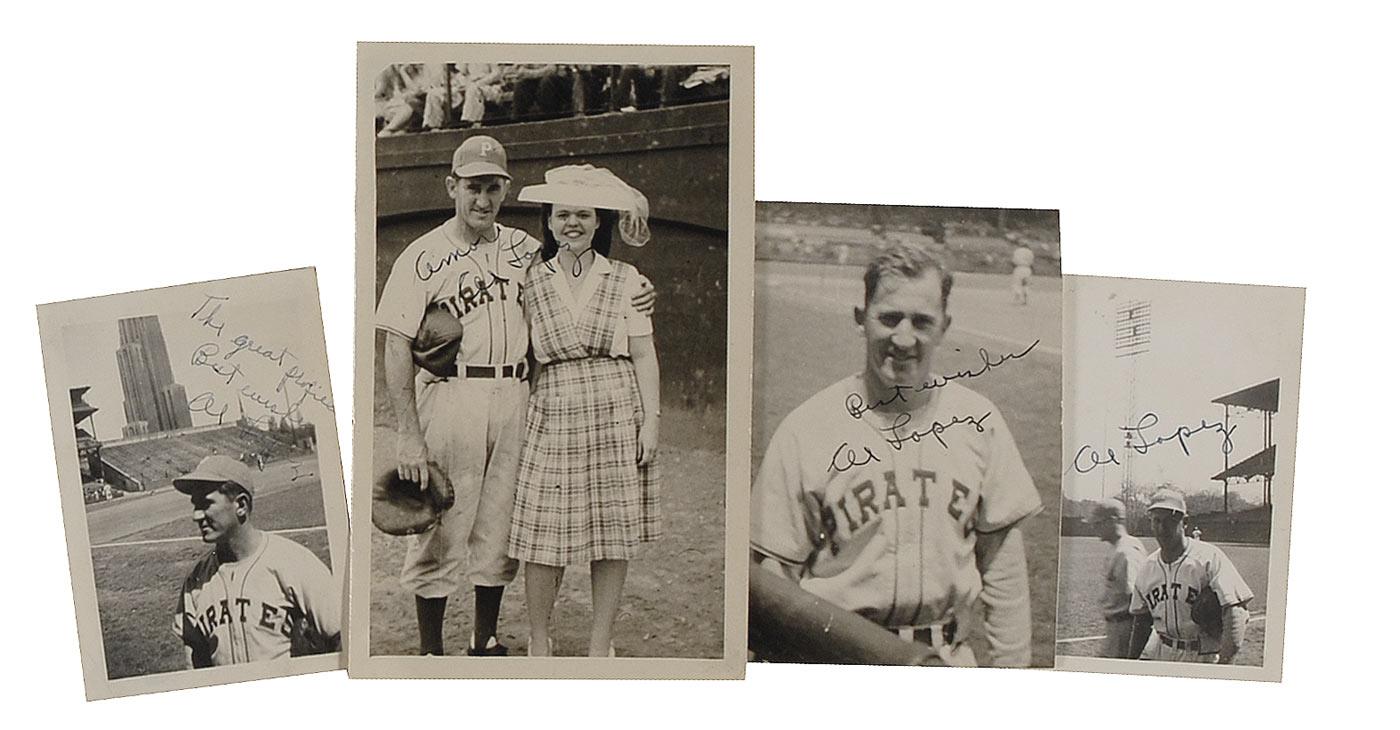 Four vintage glossy candid photos, ranging in size from 2.5 x 3.5 up to 3.5 x 5.5, each signed in blue or black ink, with Lopez adding an inscription to one, and “The great profile,” to another. In fine condition, with scattered surface marks and a few mild creases. Accompanied by three other unsigned glossy candid photos.