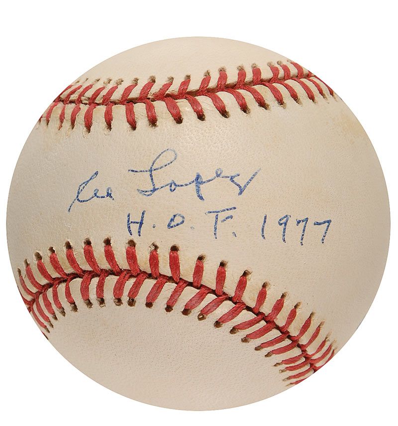 Official Rawlings American League baseball signed in blue ballpoint on the sweet spot, “Al Lopez H.O.F. 1977.” In fine condition, with some scattered light toning.