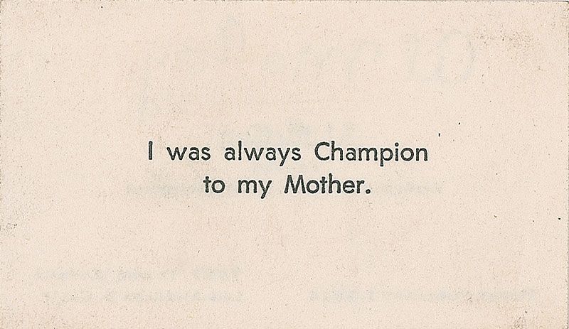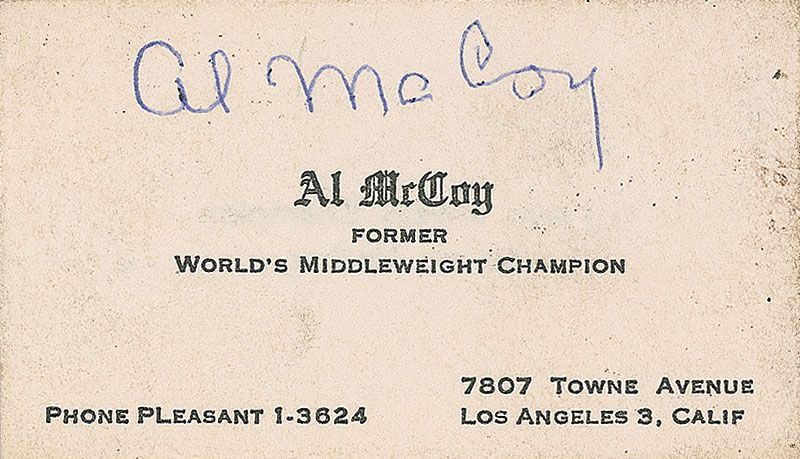 Former middleweight champion of the world (1894–1966) who amassed a record of 99–40–18. One of McCoy’s business cards, 3 x 1.75, heralding McCoy as the “former world’s middleweight champion,” signed across the top in blue ballpoint. In fine condition, with some scattered light soiling.