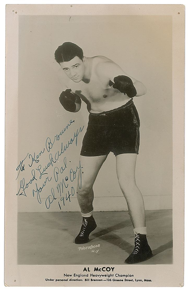 Vintage glossy 5 x 8 promotional photo of the New England heavyweight champ, signed and inscribed in fountain pen, "To Ken Browne, Good luck always, Your pal, Al McCoy, 1940.” In very good to fine condition, with tack holes to the borders, and a vertical bend to the left of McCoy's image.