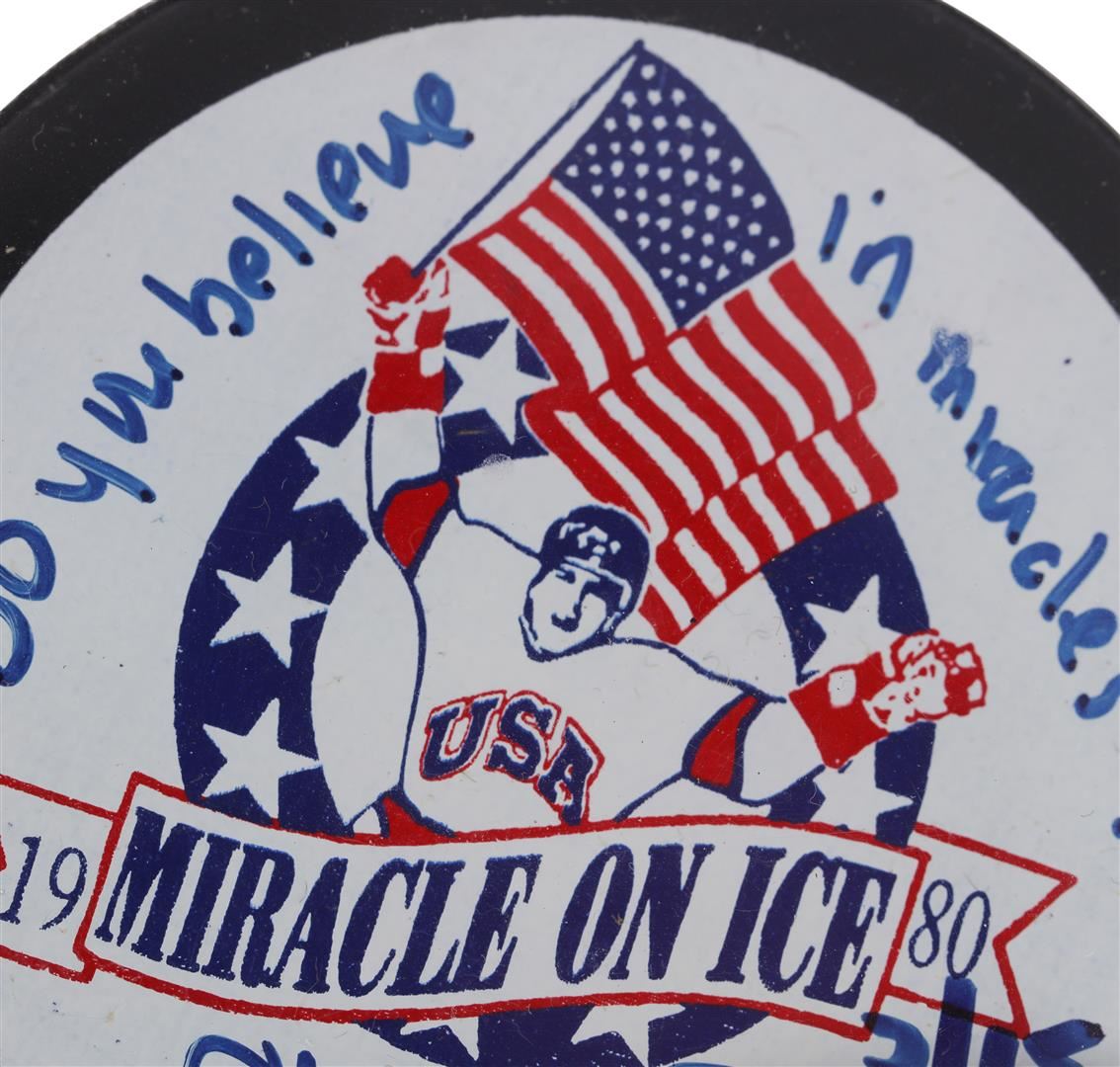 One "Miracle on Ice" puck celebrating the XIII Olympic Winter Games in Lake Placid. The puck is signed by broadcaster Al Michaels.