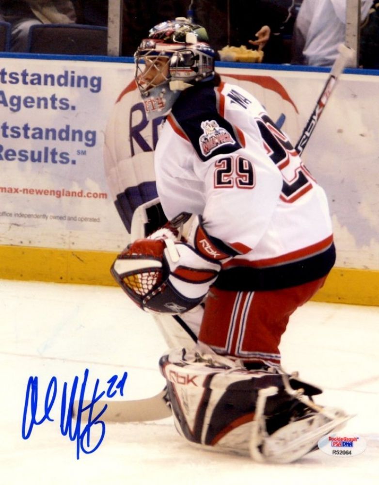 8x10 glossy photo hand-signed in blue felt tip pen by Al Montoya (Coyotes, Islanders). The autograph includes a PSA/DNA "Rookie Graph" hologram for authenticity purposes. "Rookie Graph" is the autographed memorabilia equivalent to a rookie card. The PSA/DNA definition of a "Rookie Graph" is as follows: "Any item that is autographed and received by PSA/DNA prior to the beginning of the athlete's second full season."