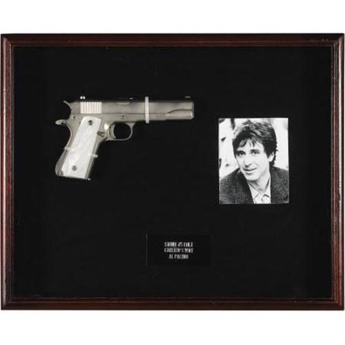 <B>Al Pacino Stunt Colt .45 from "Carlito's Way."</B></I> A prop nickel-plated Colt .45 automatic with faux mother-of-pearl grips used by Pacino in the 1993 crime drama. The prop is in Excellent condition and has been mounted along with a b&w 4" x 5" photo of the actor in a 20.5" x 16.5" x 2.5" display box. <I> Accompanied by COA from L.A. Prop and Wardrobe Co.</B></I><BR><BR><b>Shipping:</b> Framed - with Glass, Medium (<a target="_blank" href="http://www.heritageauctions.com/common/shipping.php">view shipping information</a>)