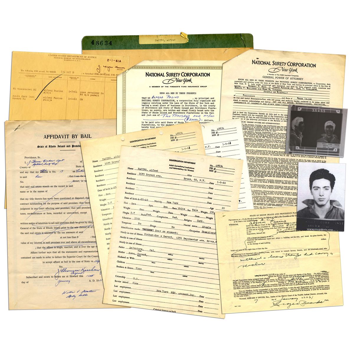 Al Pacino official January 1961 arrest record and mug shot. As a 20 year-old burgeoning actor, Pacino was arrested in Woonsocket, Rhode Island with two friends after officers observed their car circling the same block of a neighborhood. When police searched the car, they found a .38 in the trunk. Not being able to procure the $2,000 bail, the men spent three days in jail and were released with a bail bond. With nine documents in total, lot includes: (1) Pacino's mugshot, in negative, with both a front and profile portrait, measuring 5'' x 4''; (2) ''Affidavit by Bail'' document, measuring 8.5'' x 13''; (3) bail bond with the National Surety Corporation, reading in part, ''...Alfred Pacino has been arrested on a warrant issued by the Woonsocket Police charged with the crime of Possession of a Concealed Weapon...'' and measuring 8.5'' x 14''; (4) National Surety Power of Attorney document, measuring 8.5'' x 14''; (5) FBI record sheet, 8'' x 11''; (6) Twelfth District Court appearance receipt, measuring 8.5'' x 7'' and (7-9) three copies of his identification sheet with the Adult Correctional Institutions and Reformatory for Women Identification Department, each measuring 8.5'' x 11''. Light wear and toning, overall in very good condition.