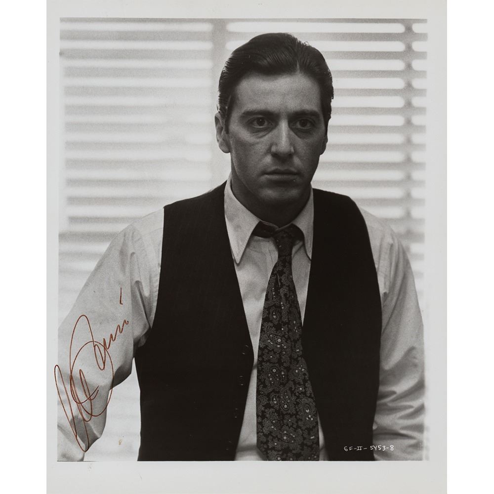 Fantastic vintage glossy 8 x 10 photo of Al Pacino in his iconic role as Michael Corleone in The Godfather Part II, signed in brown felt tip. In fine condition.