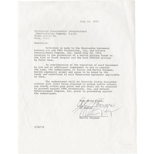 <B>Al Pacino Signed "Serpico" Contract.</B></I> One-page agreement between Al PAcino and Produzione DeLaurentiis International, dated July 24, 1972, engaging the actor to star in the 1973 crime drama/biopic, and signed by Pacino and producer Martin Bregman in black ballpoint. In Excellent condition with minimal wear. <I>Accompanied by LOA from PSA/DNA.</B></I><BR><BR><b>Shipping:</b> Flat Material, Small (<a target="_blank" href="http://www.heritageauctions.com/common/shipping.php">view shipping information</a>)