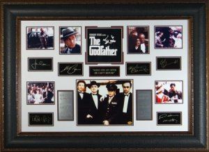 The Godfather custom premium framed unautographed Signature Engraved oversize 27x39 piece. FEATURING THE ENGRAVED SIGNATURES OF AL PACINO, MARLON BRANDO, TALIA SHIRE, JAMES CAAN, ROBERT DUVALL, AND DIANE KEATON. FRAMED AS SHOWN TO AN OVER-ALL SIZE OF 27"X39"