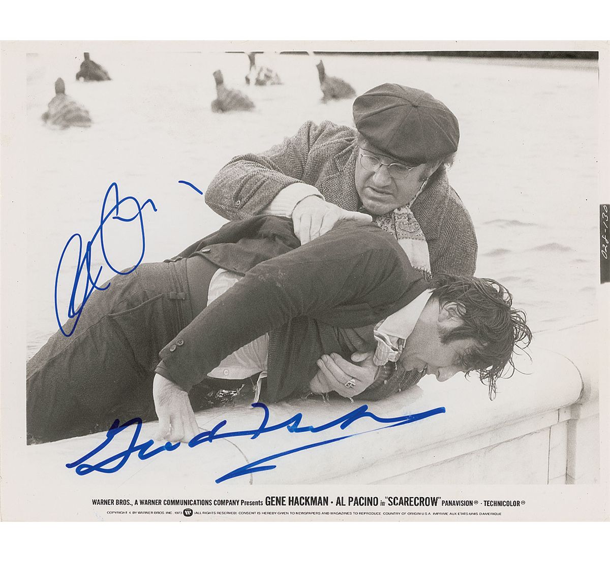 Glossy 10 x 8 publicity photo from the 1973 road movie Scarecrow, signed in blue felt tip by both. In fine condition, with a few tiny tears to upper edge and minor creasing to corners.