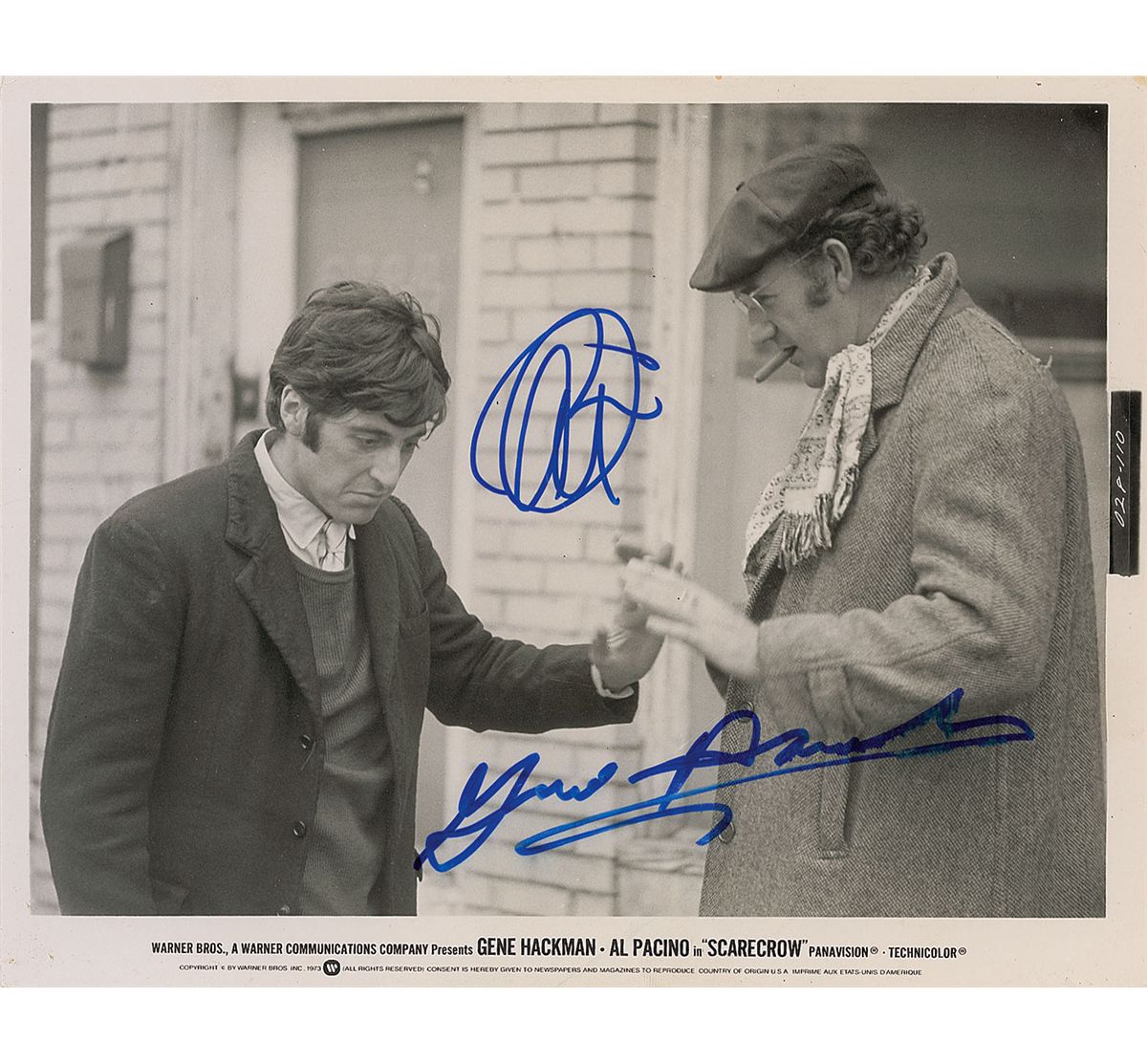 Glossy 10 x 8 publicity photo of Pacino and Hackman in the 1973 film Scarecrow, signed by both in blue felt tip. In fine condition, with light scattered creasing.