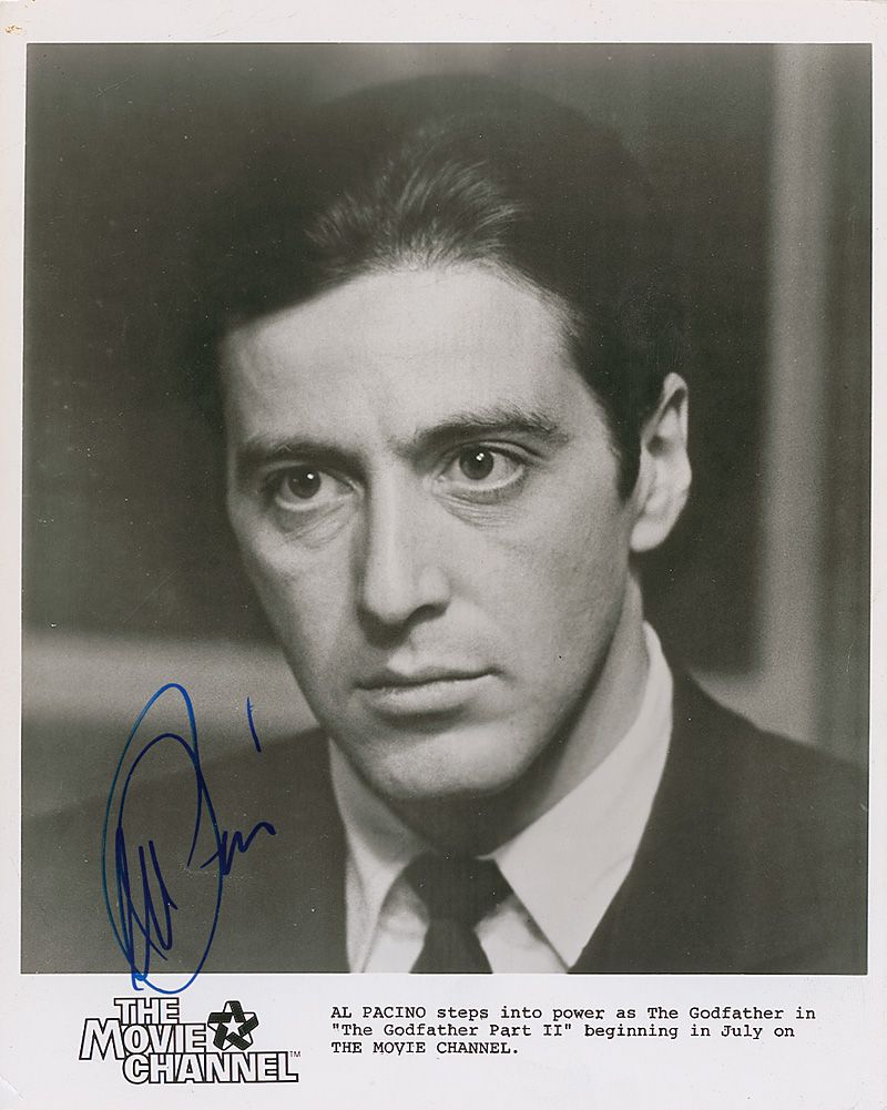 Glossy 8 x 10 Movie Channel promotional photo of Pacino as Michael Corleone, signed in blue felt tip. In fine condition, with some scattered light surface marks, creases, and impressions.