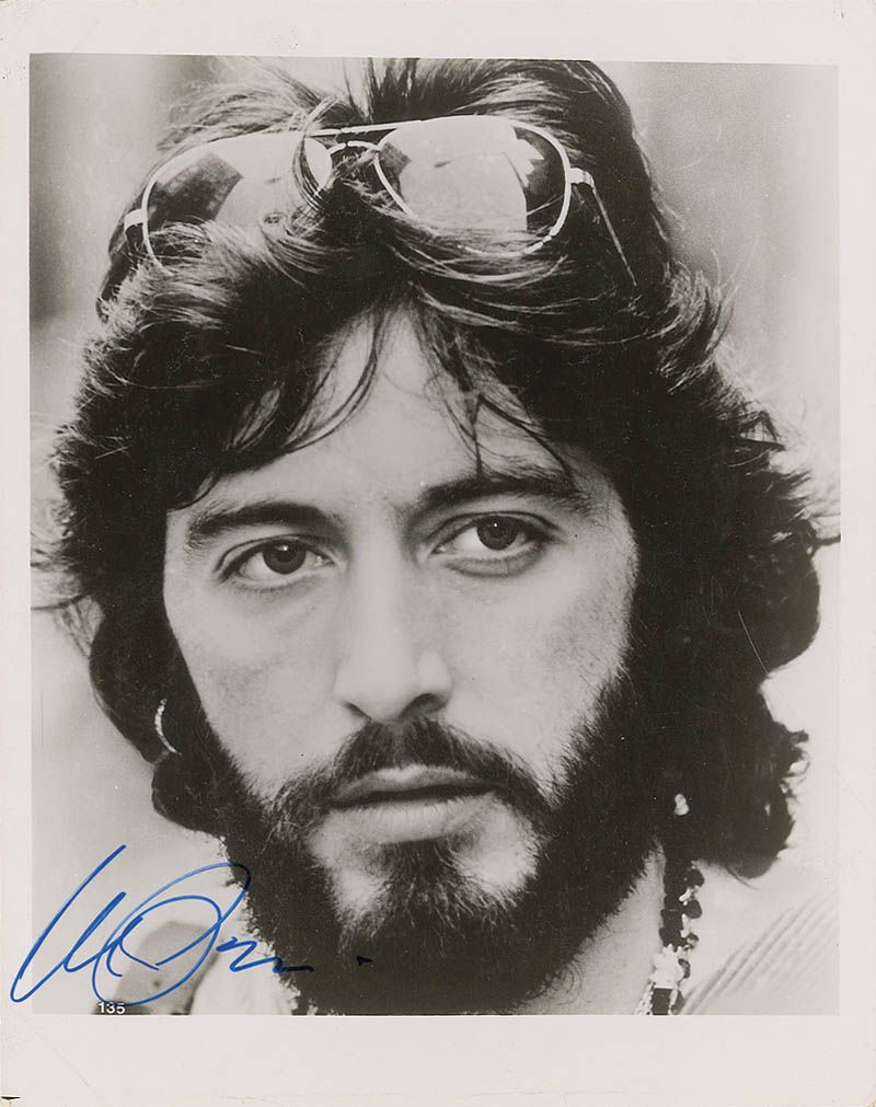 Glossy 8 x 10 photo of a bearded Pacino in Serpico, signed in blue felt tip. In very good condition, with light scattered creases, marks, and impressions.