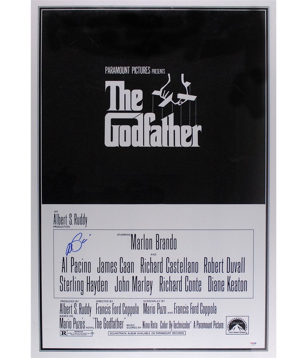 Desirable replica movie poster for The Godfather, 27 x 40, signed in blue felt tip by Pacino. Rolled and in fine condition, with light handling creases and a PSA/DNA label affixed to the lower corner (certificate of authenticity not present).