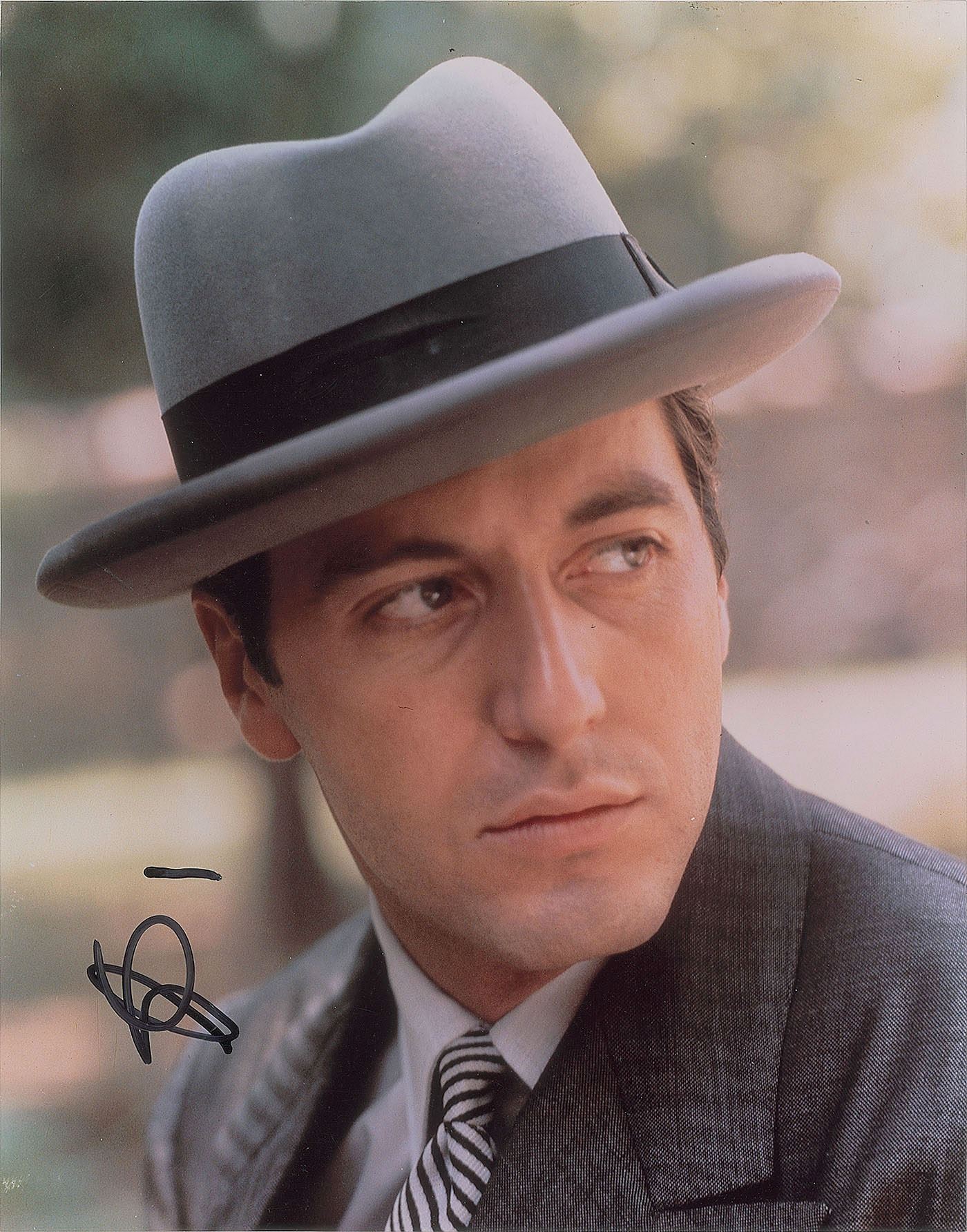 Crystal-clear color glossy 11 x 14 close-up photo of Pacino as Michael Corleone from the 1972 crime film The Godfather, signed in black felt tip. In fine condition.