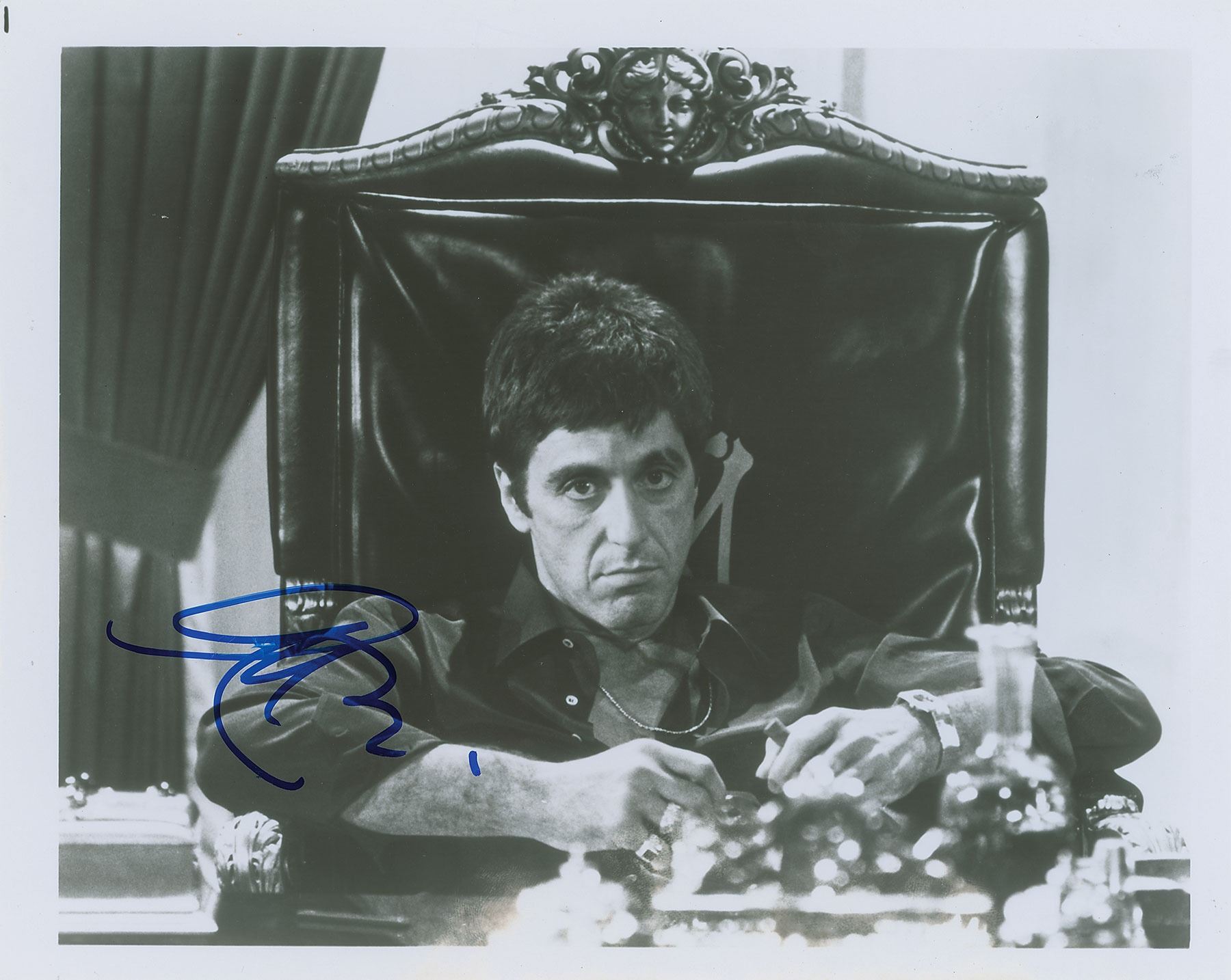 Glossy 10 x 8 photo of Al Pacino as drug lord Tony Montana from the 1983 crime film Scarface, signed in blue felt tip. In fine condition.