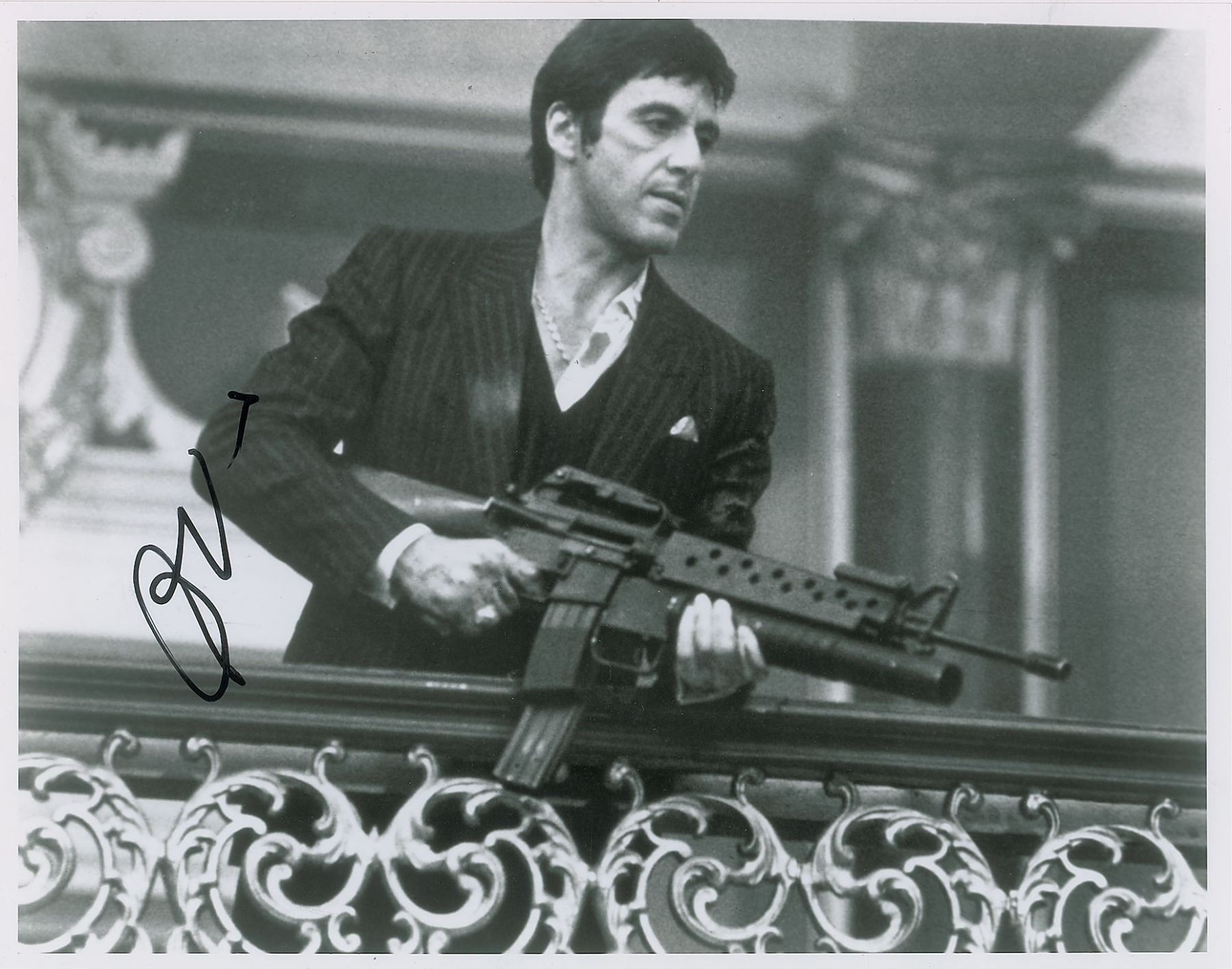 Satin-finish 14 x 11 photo of Al Pacino as drug lord Tony Montana from the 1983 crime film Scarface, signed in black felt tip. In fine condition.