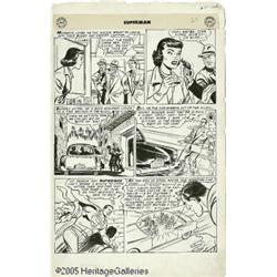 <B>Al Plastino (attributed) - Superman #95, page 8 Original Art (DC, 1955).</B></I> In a case of mistaken identity, Clark Kent's stand-in, joke-loving Pointdexter Wells is kidnapped, along with Lois Lane, by a gang of hoods. Page eight from the cover story, "The Practical Joker," written by Alvin Schwartz, features a great Clark Kent-to-Superman sequence by Al Plastino. Plus some x-ray vision action! The art has an image area of 13" x 18" and has some slight edge wear, otherwise is in Excellent condition. The DC indicia at the top is a recent photocopy replacement.