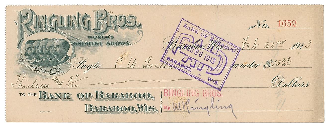Ringling Bros. business check, 8.75 x 3.25, filled out in another hand and signed in pencil by Ringling, "Al Ringling," payable to C. W. Goette for $13.28, February 22, 1913. The check features an attractive design with an image of the five Ringling Brothers in the corner. In fine condition, with two unobtrusive vertical folds.