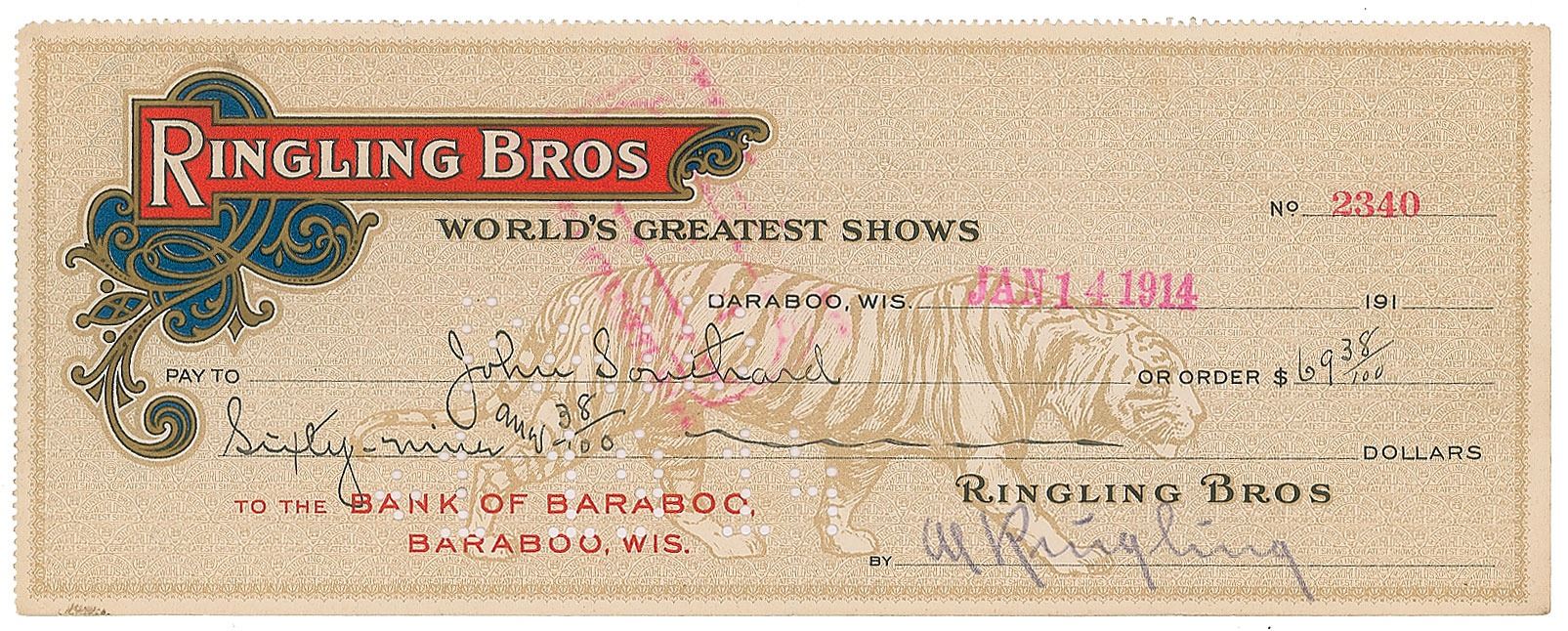 One of the famed Ringling Brothers (1864–1926) who parlayed their circus into a multimillion-dollar entertainment enterprise. Colorful Ringling Bros. business check, 8.5 x 3.25, filled out in another hand and signed in pencil by Ringling, payable to John Southard for $69.38, January 14, 1914. In fine condition.