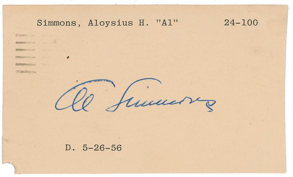 Baseball Hall of Famer who hit 307 home runs and had a .334 batting average. Ballpoint signature, “Al Simmons,” on a 5 x 3 government postcard (postmarked 7/12/1948), with typed collector’s notations above and below signature. In fine condition, with missing lower left corner tip, a bit of light soiling, and small postal marks above signature.