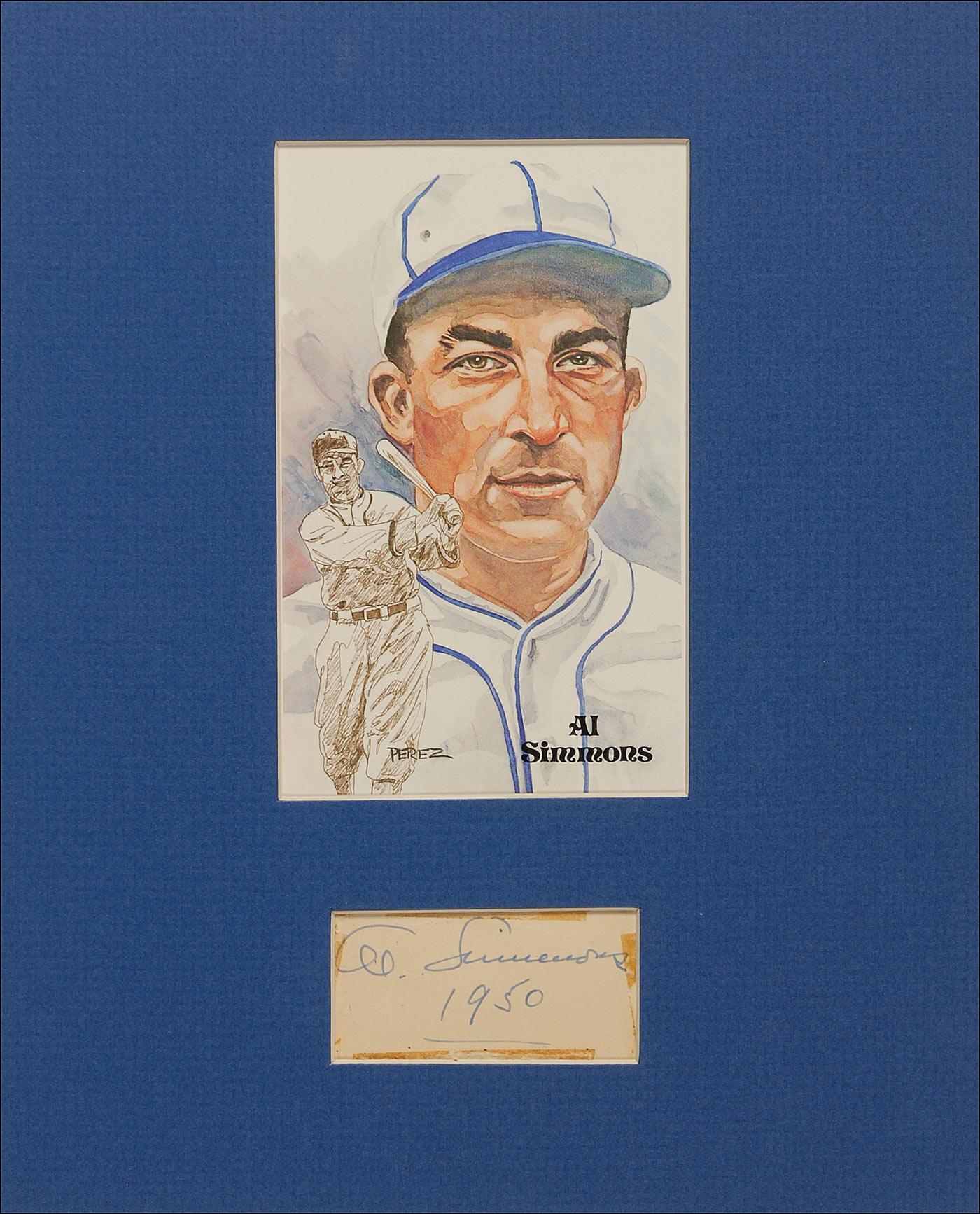 Vintage ink signature, “Al Simmons, 1950,” on an off-white 2.5 x 1.25 slip. Matted with a Perez-Steele card to an overall size of 8 x 10. Adhesive staining at the edges touching portions of his name and light toning, otherwise fine condition.