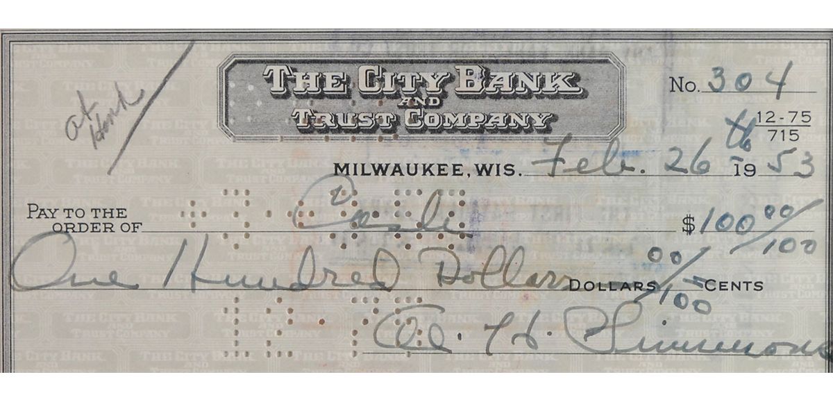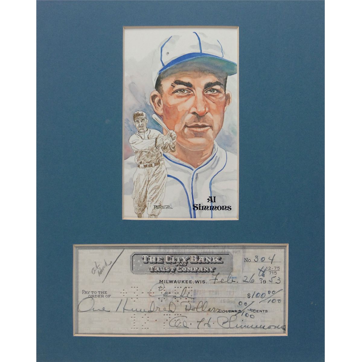 Scarce bank check, 5.75 x 2.5, filled out and signed by Simmons, “Al H. Simmons,” payable to Cash for $100, February 26, 1953. Matted with a Perez-Steele card of Simmons to an overall size of 8 x 10. In fine condition, with expected bank stamps, notations, and cancellation holes (affecting only the first letter of the signature).